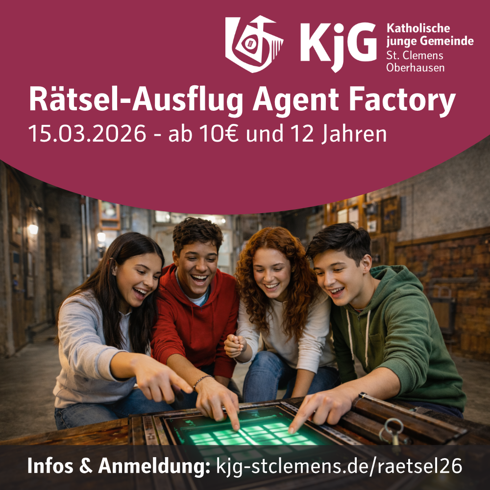 Am 15. März geht es für alle Interessierten Jugendliche und junge Erwachsene zusammen mit der KjG St. Clemens in die Agent Factory der Mining Adventure World in Dorsten. Die Agent Factory ist ein sogenannter Challenge Room: In kleinen Teams (2 bis 6 Personen) tretet Ihr nacheinander gegen verschiedene Missionen an, die ganz unterschiedliche Fähigkeiten fordern. Mal sind logisches Denken und Kombinationsgeschick gefragt, mal Schnelligkeit, Koordination oder eine clevere Strategie. Anders als bei einem klassischen Escape Room warten hier mehrere abwechslungsreiche Aufgaben, die nur gemeinsam gemeistert werden können.